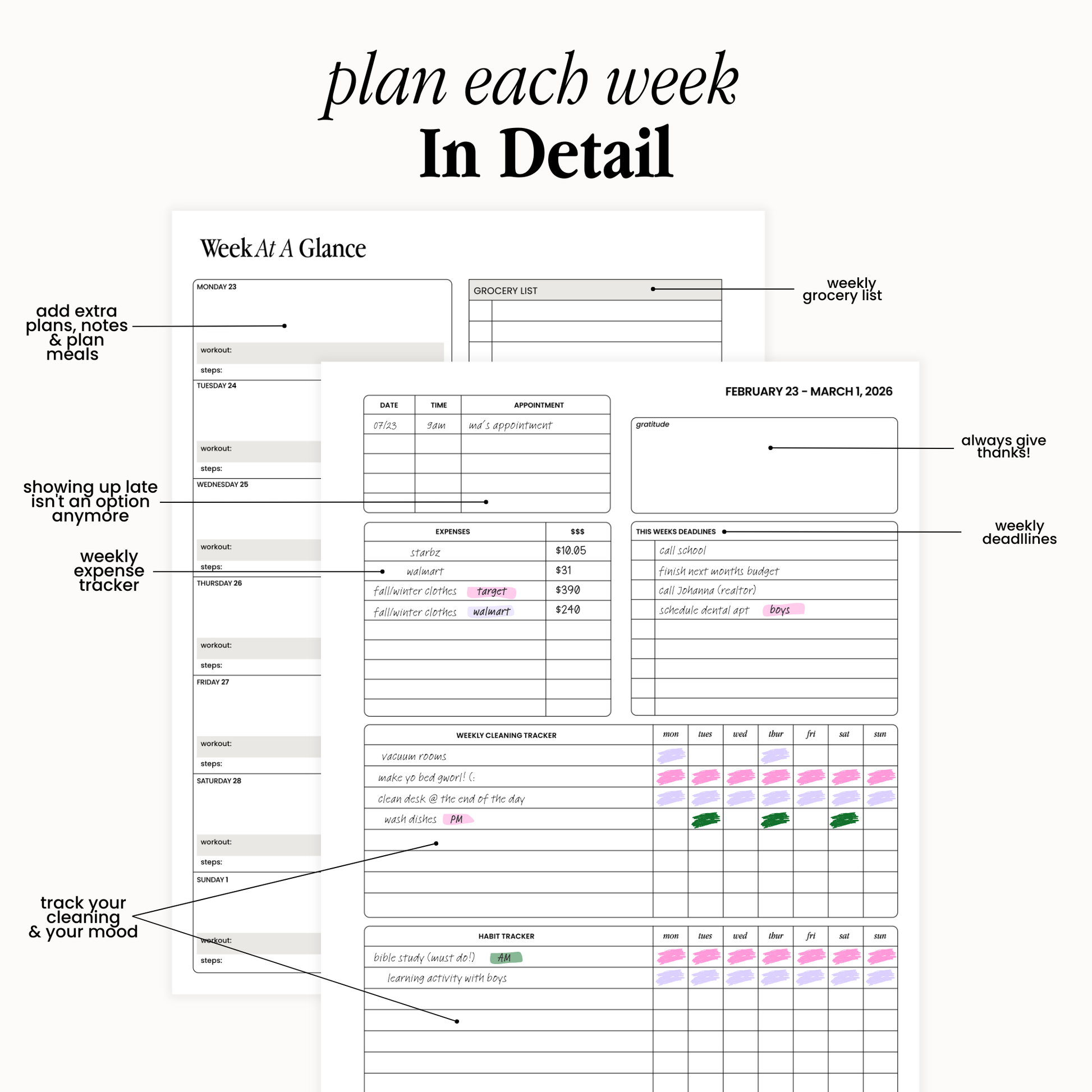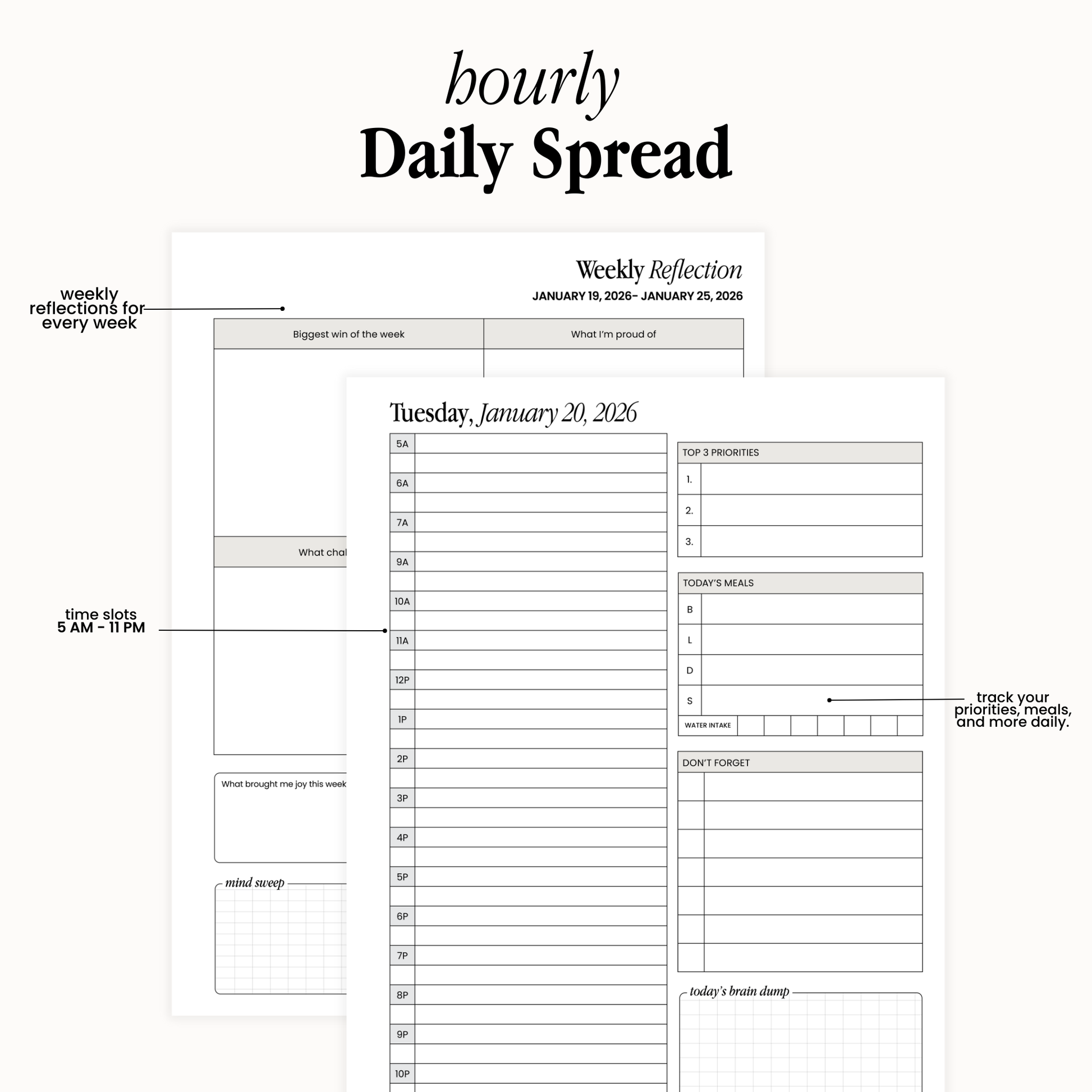 • Spacious blocks for planning, notes, and intentions