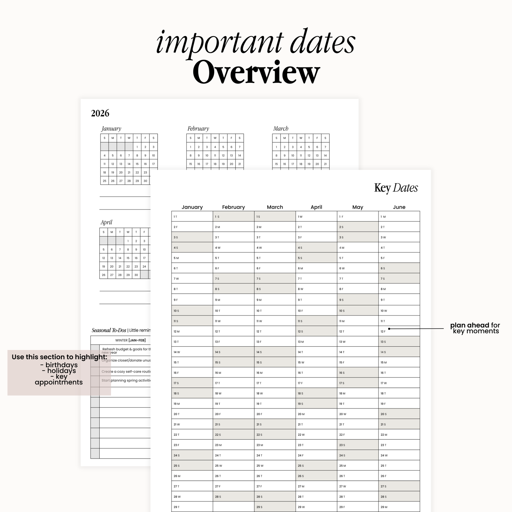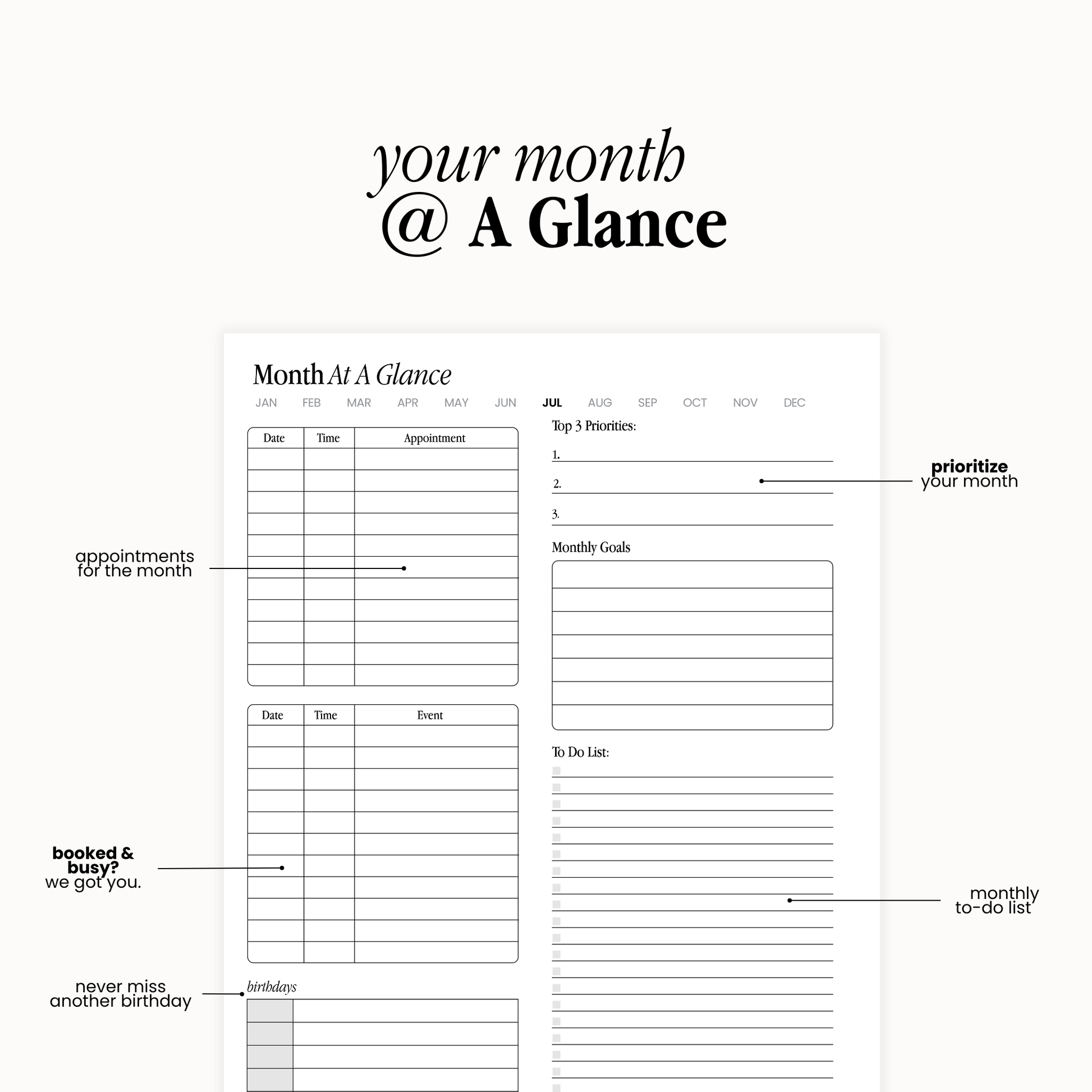 • Month At-A-Glance (priorities, events, appointments, goals, to-dos + birthday list)