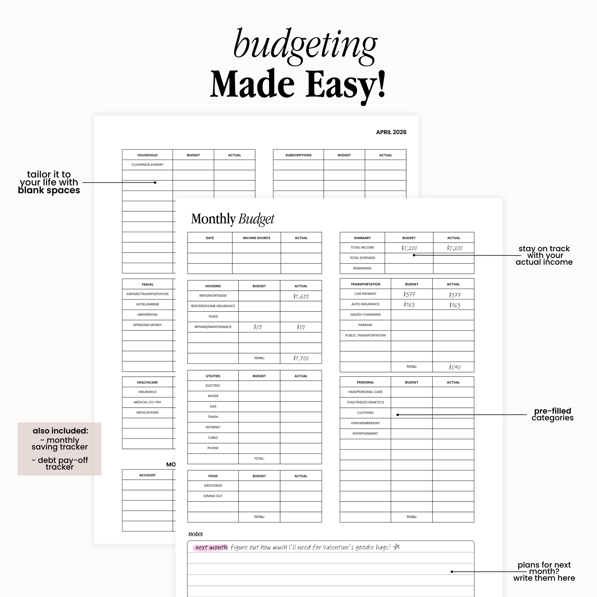 • 2-Page Monthly Budget